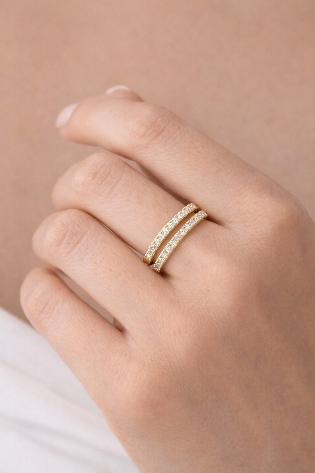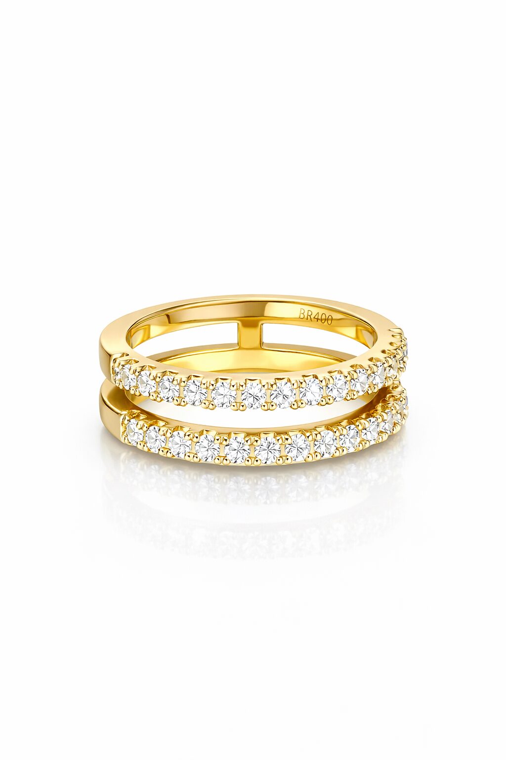 Deze ring bestaat uit 2 rijen bezet met moissanite. Deze steentjes hebben de schittering en hardheid van een brilliant.