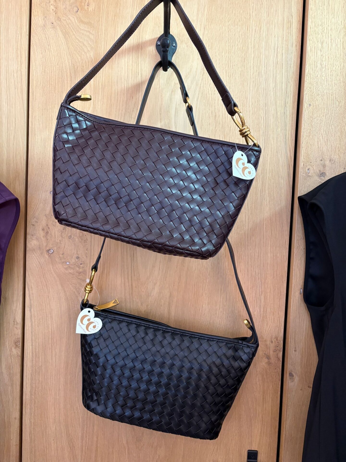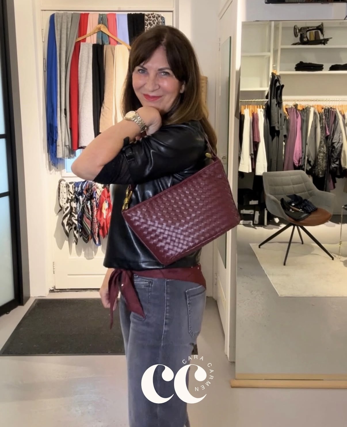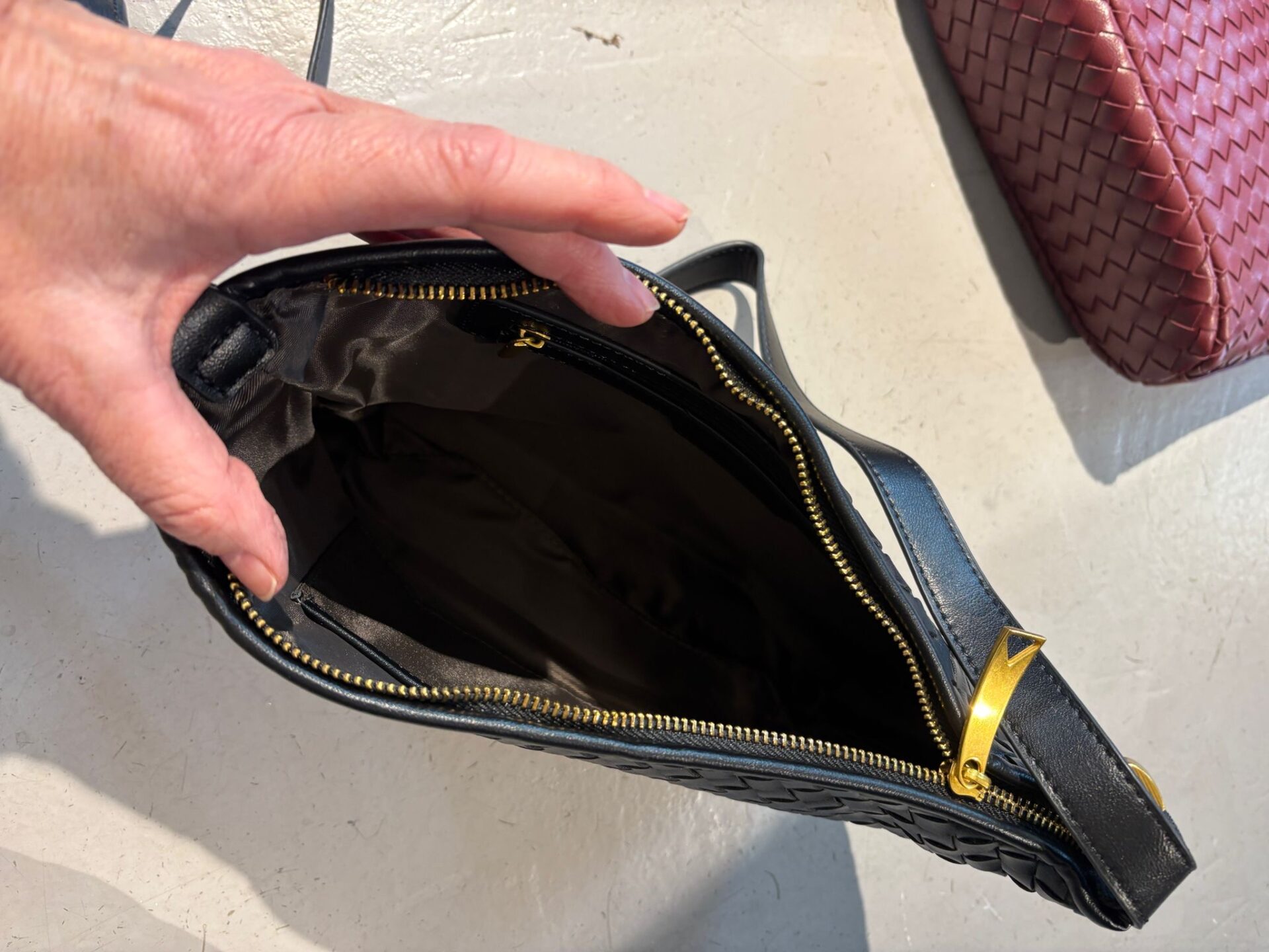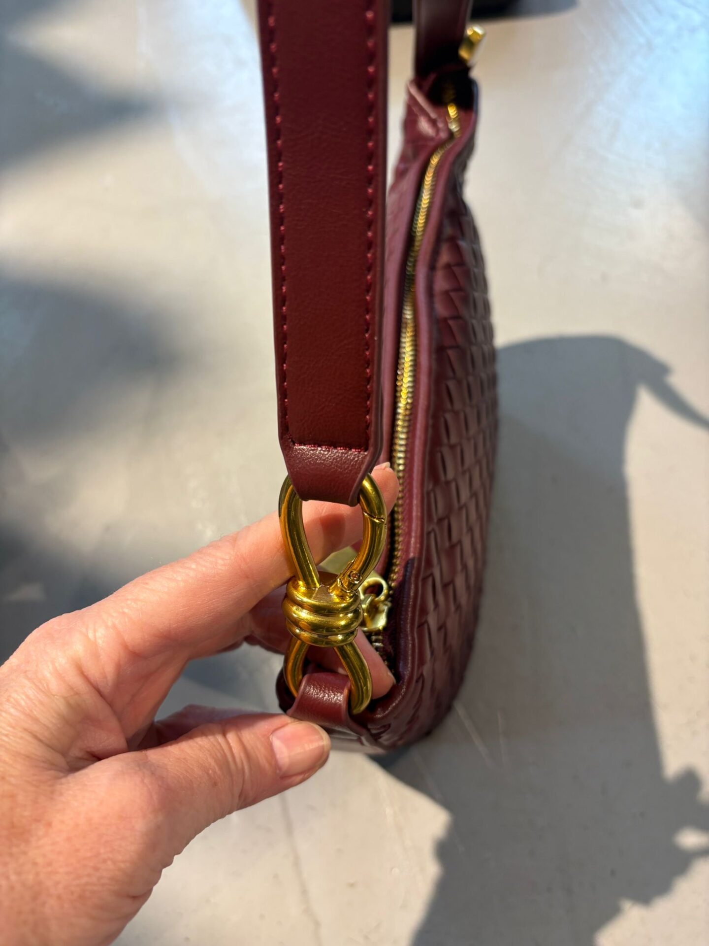 Deze tas is een elegante schoudertas van soepel gevlochten leer in een diepe bordeaux-bruin-zwarte kleur. De compacte maar ruime vorm biedt plek voor je dagelijkse essentials, terwijl de goudkleurige hardware en de subtiele schouderband elke outfit meteen een luxere uitstraling geven. Perfect voor zowel overdag als ’s avonds.